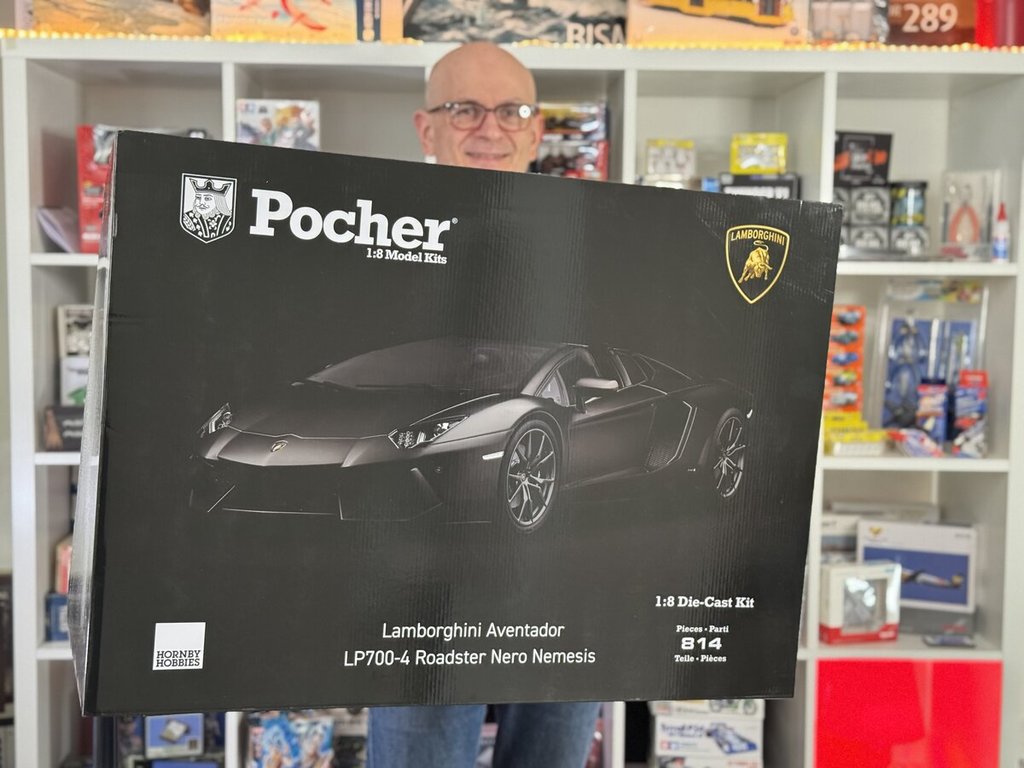 Il kit Pocher non ha bisogno di presentazioni: è il re dei modelli in scala grande. Questa Lamborghini Aventador LP700-4 Roadster nella versione Nero Nemesis è un die-cast kit da 146 pezzi, un vero capolavoro di ingegneria in miniatura.